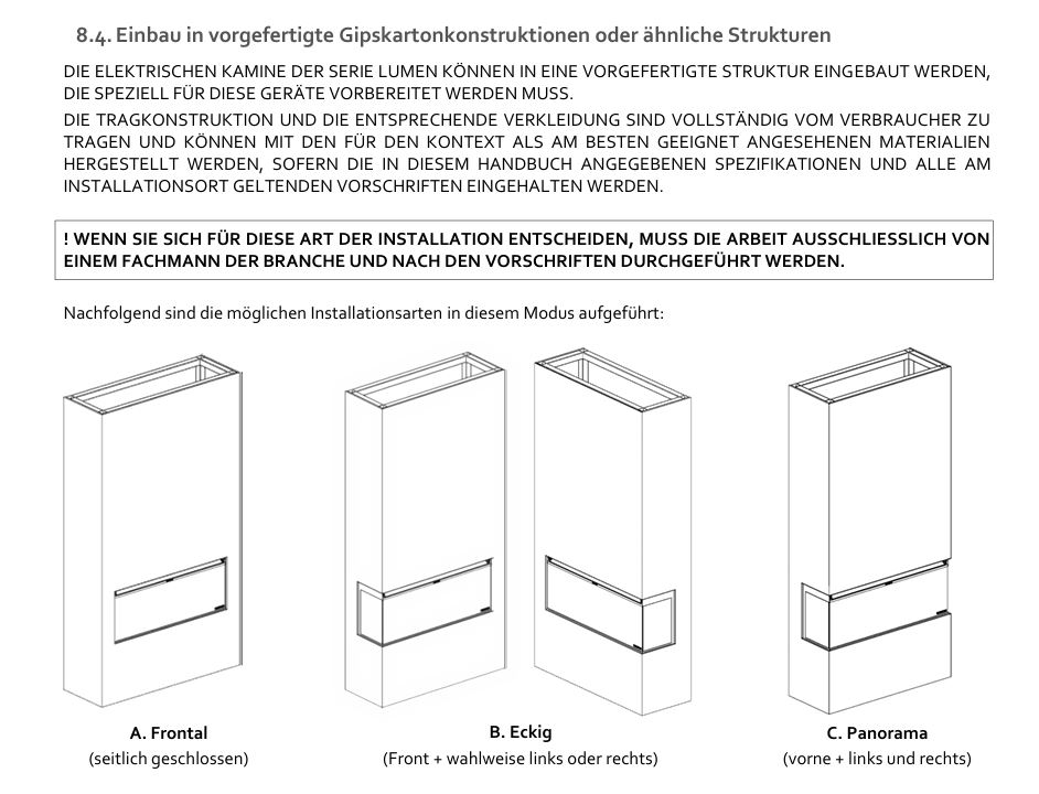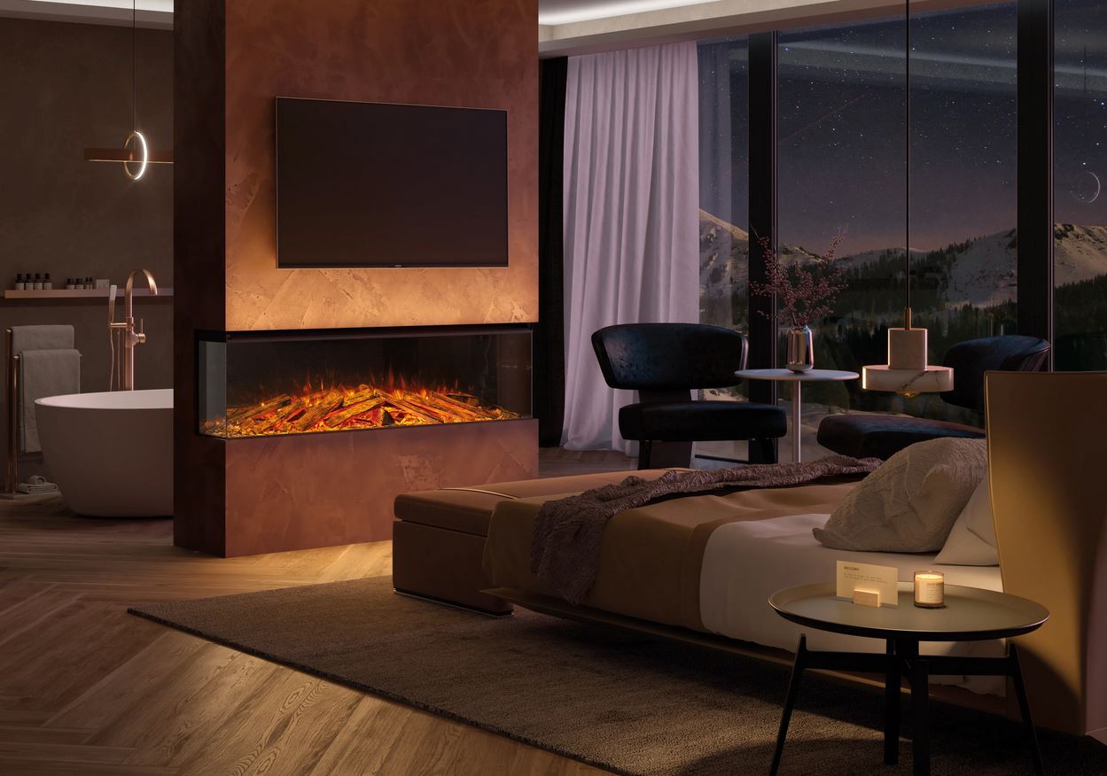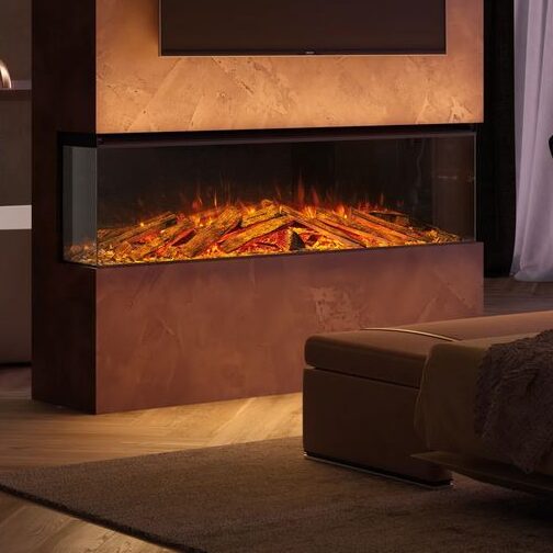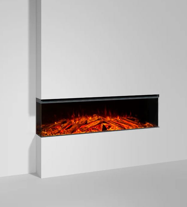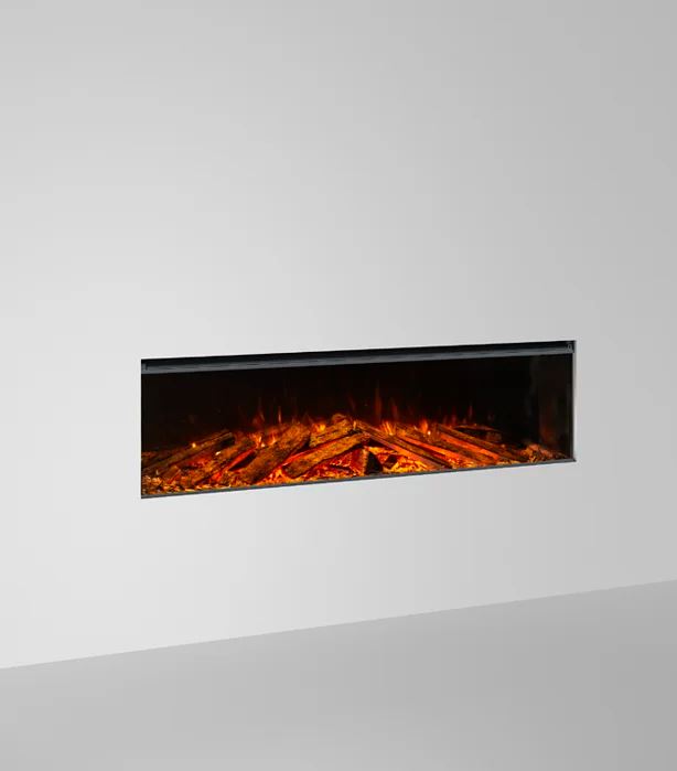 LUMEN 1600 ist der unangefochtene Mittelpunkt des Raumes. Er kann mit Rahmen an der Wand montiert oder eingebaut werden – wahlweise in drei Ausführungen: frontal, eckig oder panoramisch. Jede Perspektive betont die Flamme und schafft ein intensives, fesselndes Erlebnis.