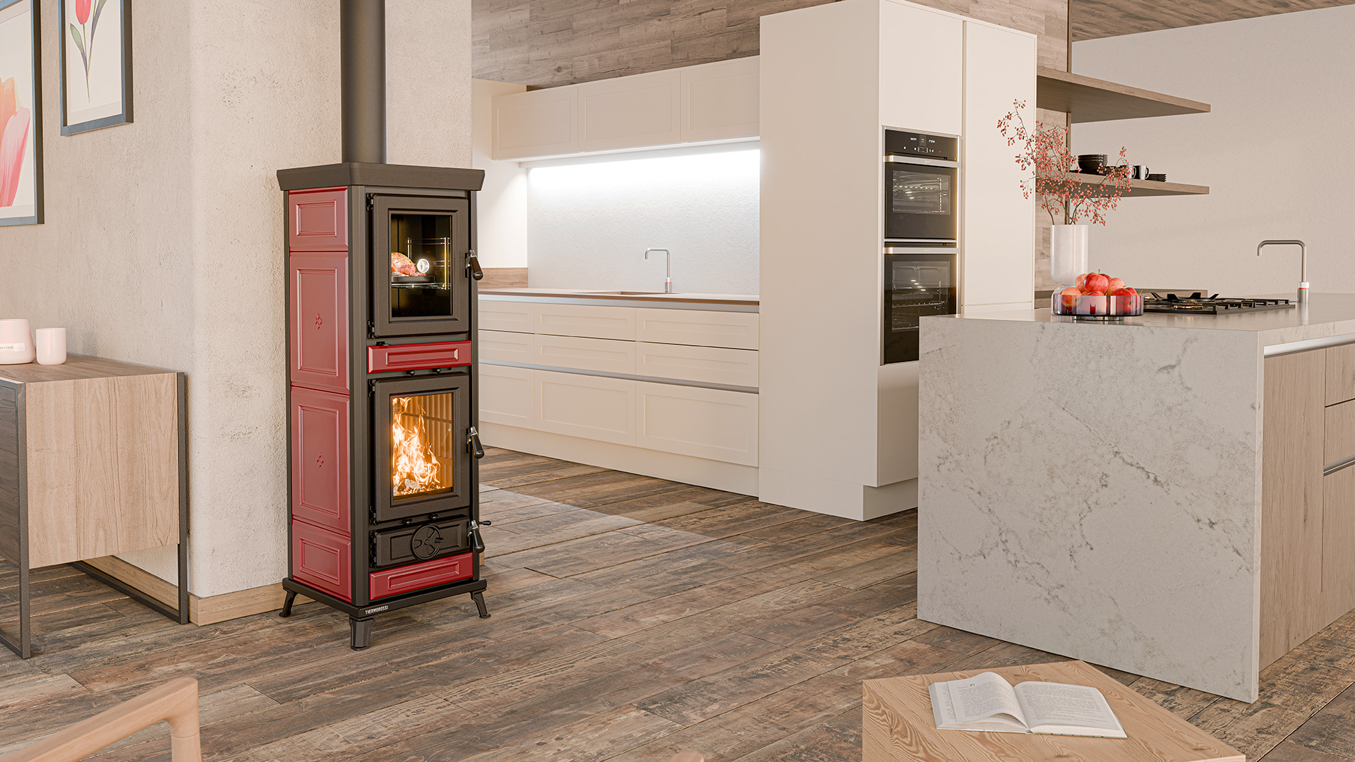 Kaminofen Thermorossi Ilaria Evo (Höhe 97 cm) Maiolica bordeaux mit Kochplatte für Notfälle im Top Deal