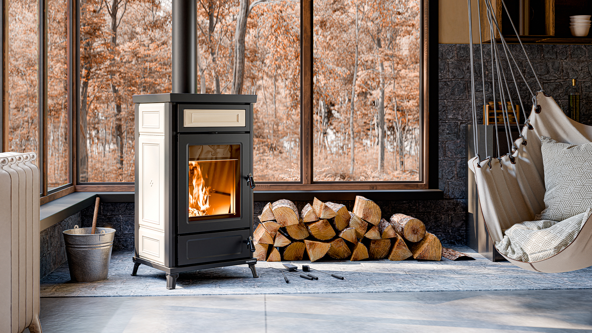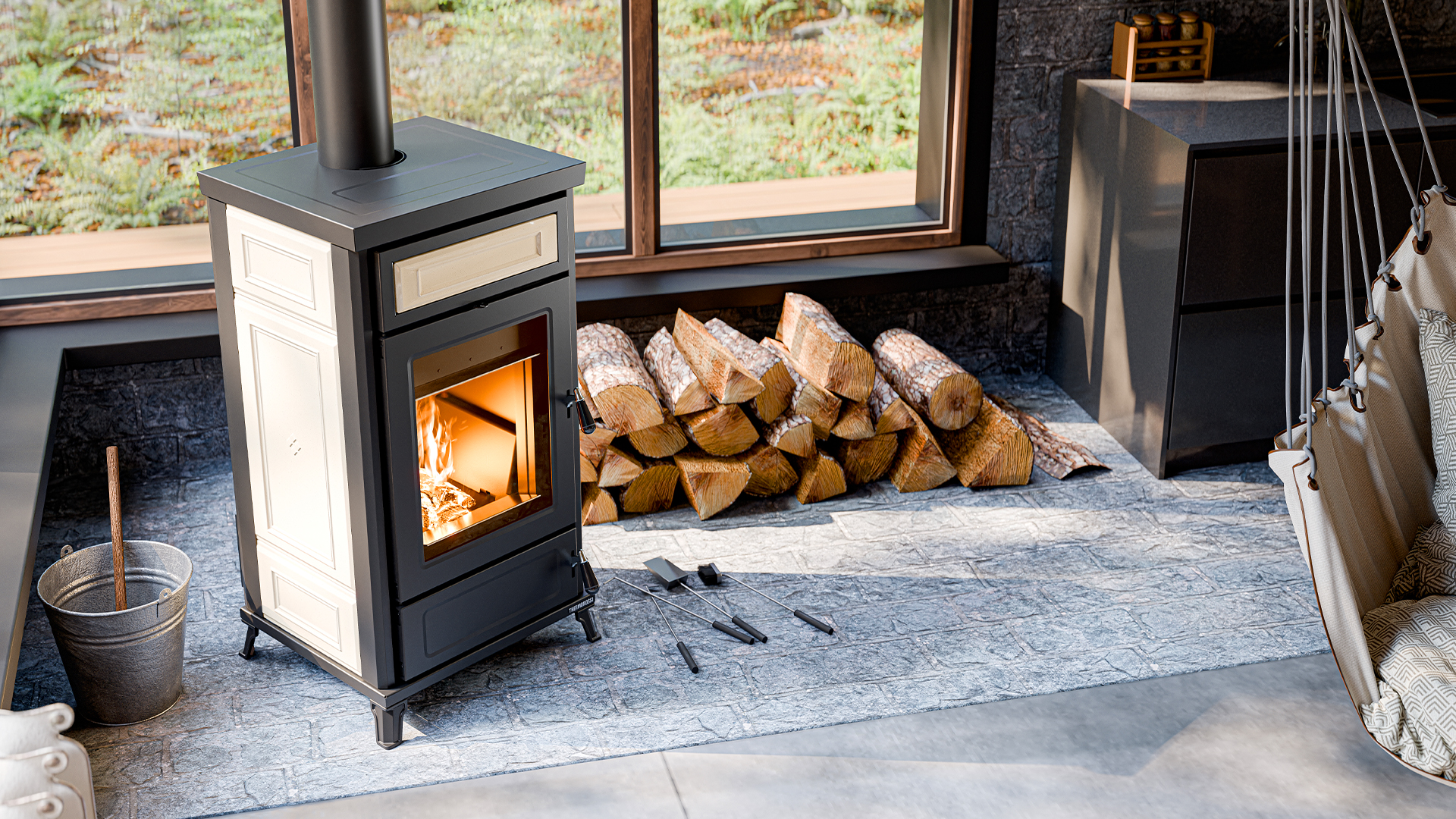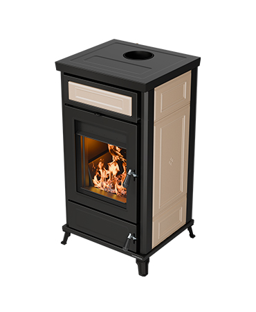 Kaminofen Thermorossi Sofia Evo (Höhe 91 cm) Maiolica beige-ahornweiß mit Kochplatte für Notfälle Osterdeal