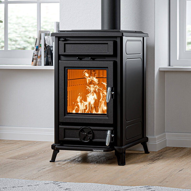 Kaminofen Thermorossi Vittoria Evo (Höhe 109 cm) Easy schwarz mit Kochplatte für Notfälle Osterdeal
