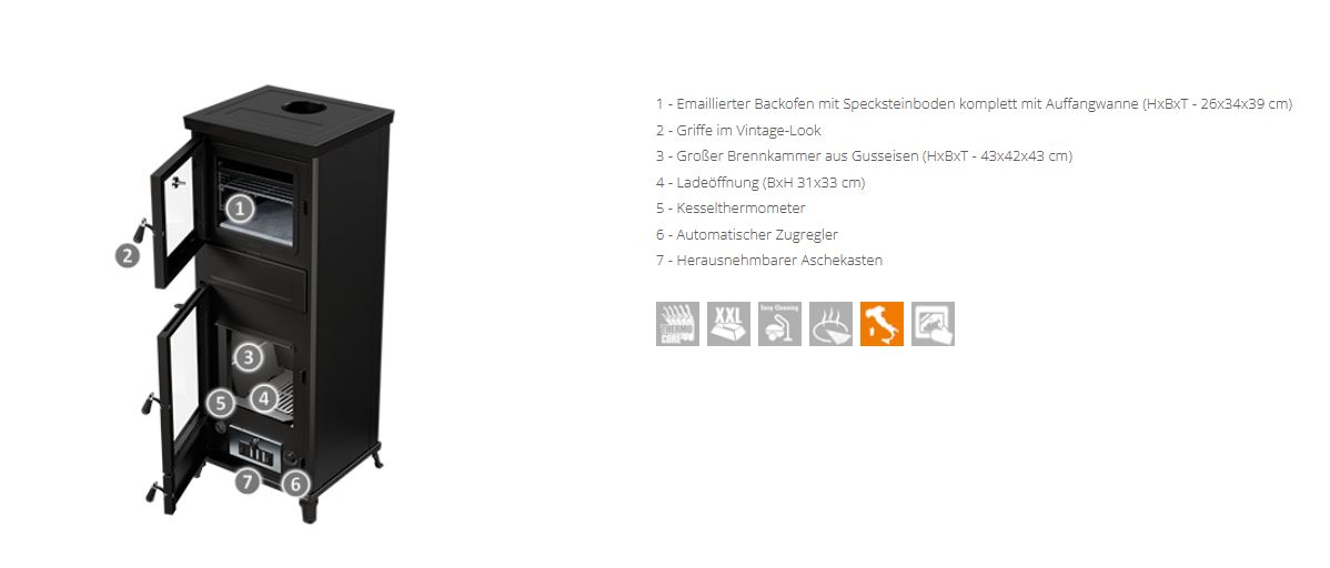 Kaminofen Thermorossi Vittoria Evo (Höhe 109 cm) Easy schwarz mit Kochplatte für Notfälle Osterdeal