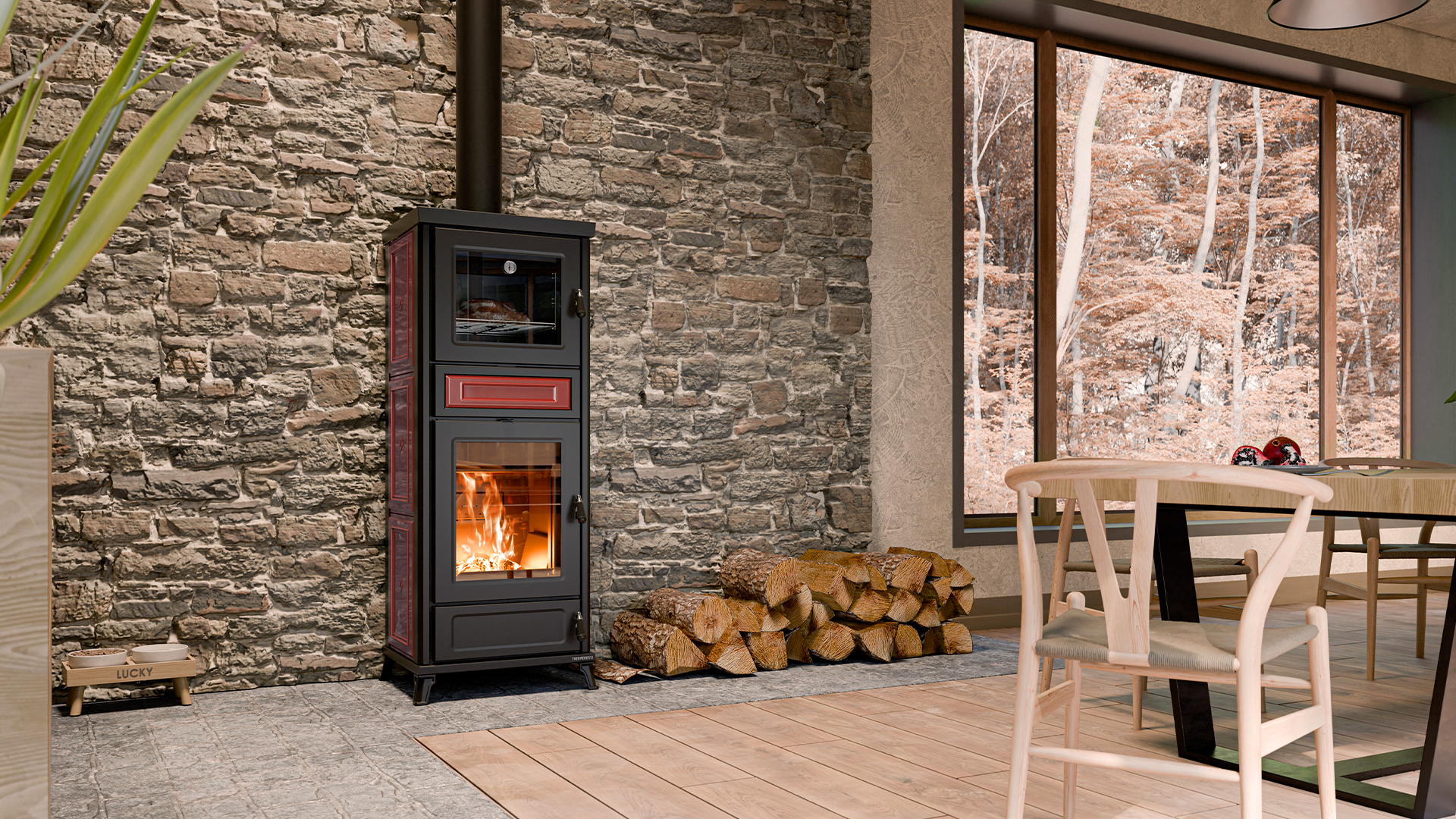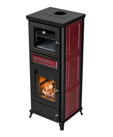 Kaminofen Thermorossi Flora Maiolica bordeaux mit Backrohr wassergeführt