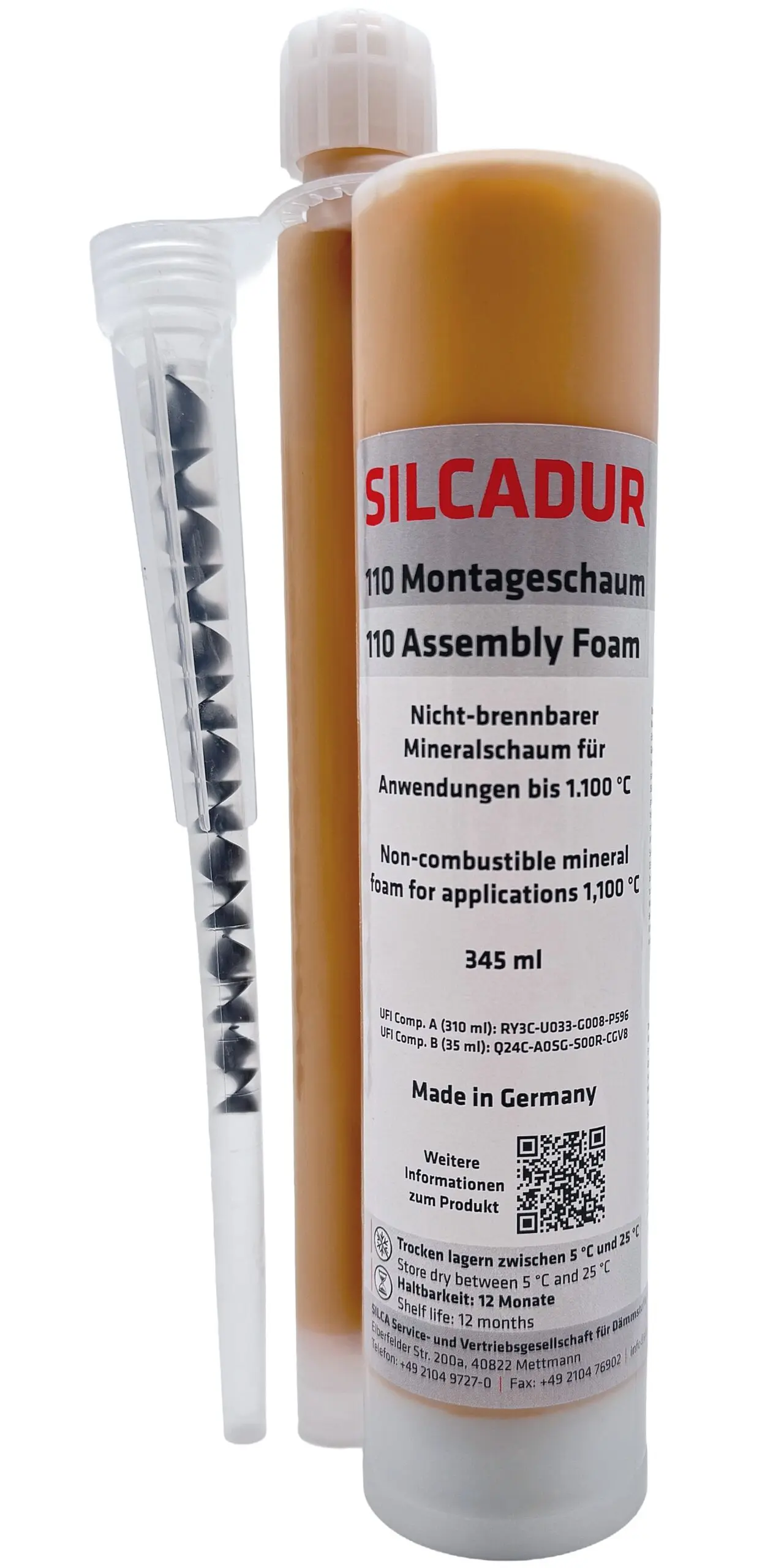 SILCADUR 110 Montageschaum ist ein 2-Komponenten-Montageschaum für den Einsatz an und in Feuerstätten. Die Hauptbestandteile sind anorganische Bindemittel sowie mineralische Komponenten.